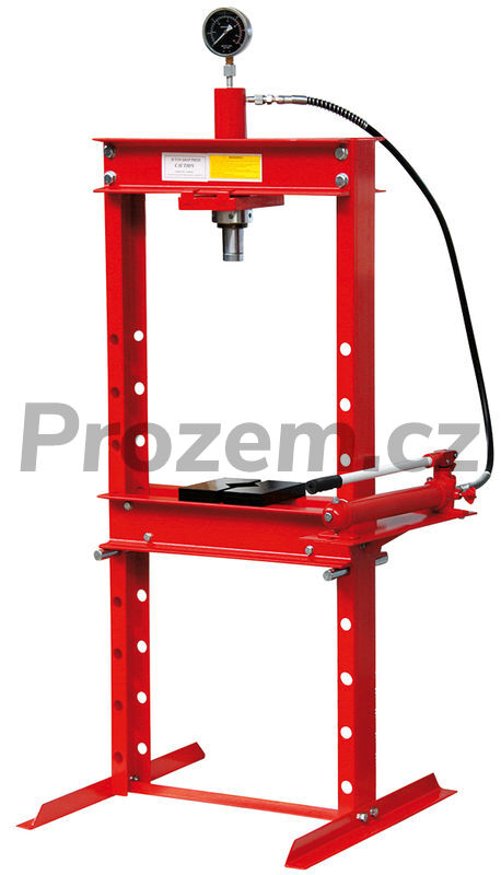 Dílenský hydraulický lis s manometrem a ručním čerpadlem. Lisovací tlak 20t, zdvih 190mm. Výškové nastavení stolu 0-988mm. Rozměry 738x700x1505mm. Hmotnost 57000g.