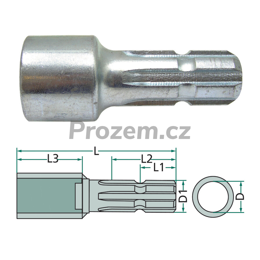 Přechodka z otvoru 25 mm na 1 3/8" (6), délka 120 mm, s kruhovým otvorem. Maximální zatížení 1250 Nm. Lze použít u vývodového hřídele a nejsou vhodné pro vývodové hřídele traktorů a motorovou brzdu.