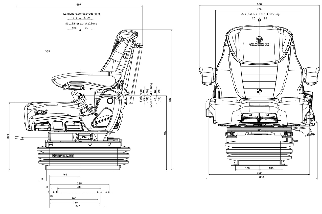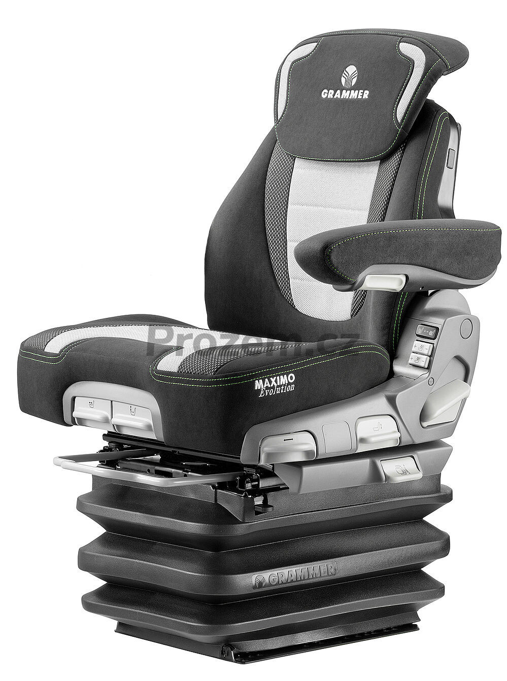 Sedadlo GRAMMER Maximo Evolution Dynamic, pro Fendt, stará konzole, 1288764CL, MSG95EL/741 12V, MSG 95EL/741 12V je vhodné pro těžké traktory s odpruženou přední nápravou a kabinou. Nový systém Dynamic Damping doplňuje osvědčené pneumatické odpružení a zajišťuje redukci vibrací při nižších frekvencích. Zároveň zabraňuje vertikálním nárazům při silném zrychlení způsobených nerovností terénu. To znamená nejen výrazné odlehčení pro řidiče, ale i nový rozměr komfortu odpružení, produktivity a hospodárnosti.