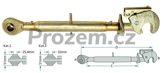 Pozinkovaný třetí bod se závitovým vřetenem M36x3mm. S tvrzeným kulovým kloubem a záchytným hákem  Kat. 2-2. Extra těžké provedení vhodné pro traktory do 160 PS (118 kW). A- Kat.2. B- Kat.2. C=460mm (Délka dutinky). D=645mm až 895mm (Pracovní délka).